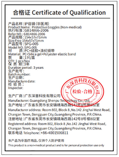 3.Ochelari (fără găuri de ventilație) Parameter specifications